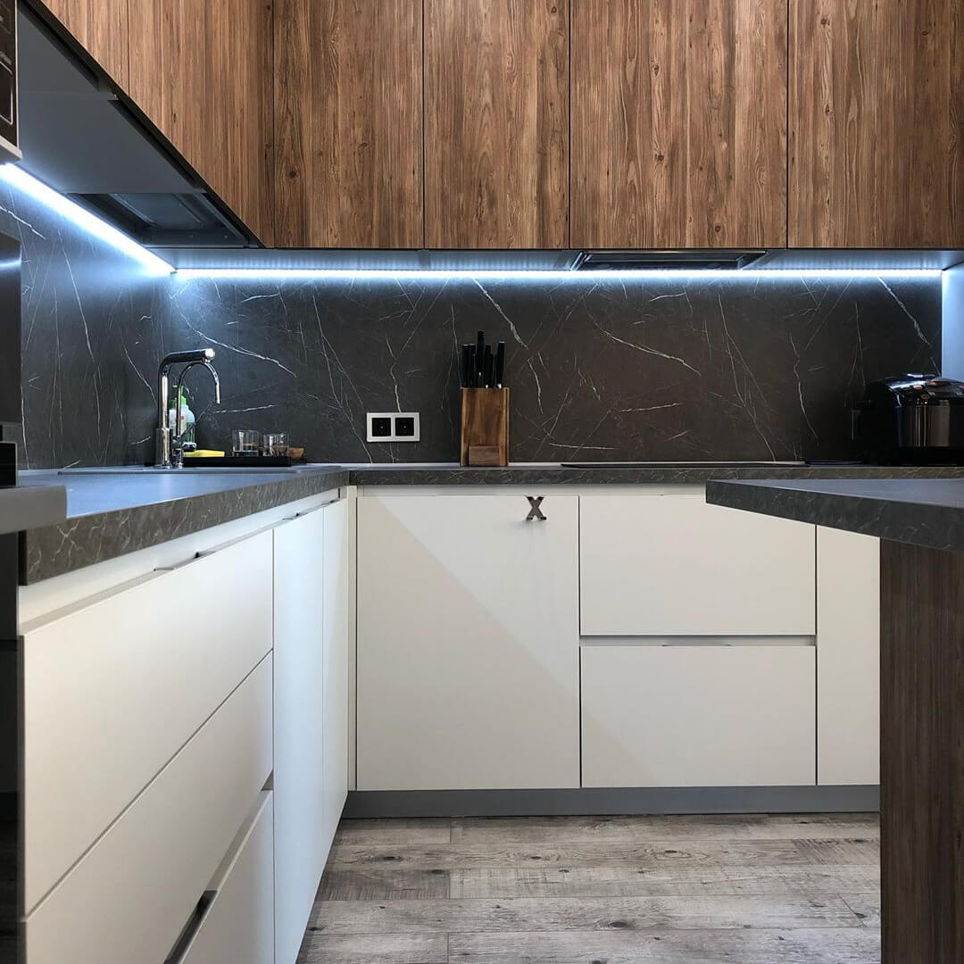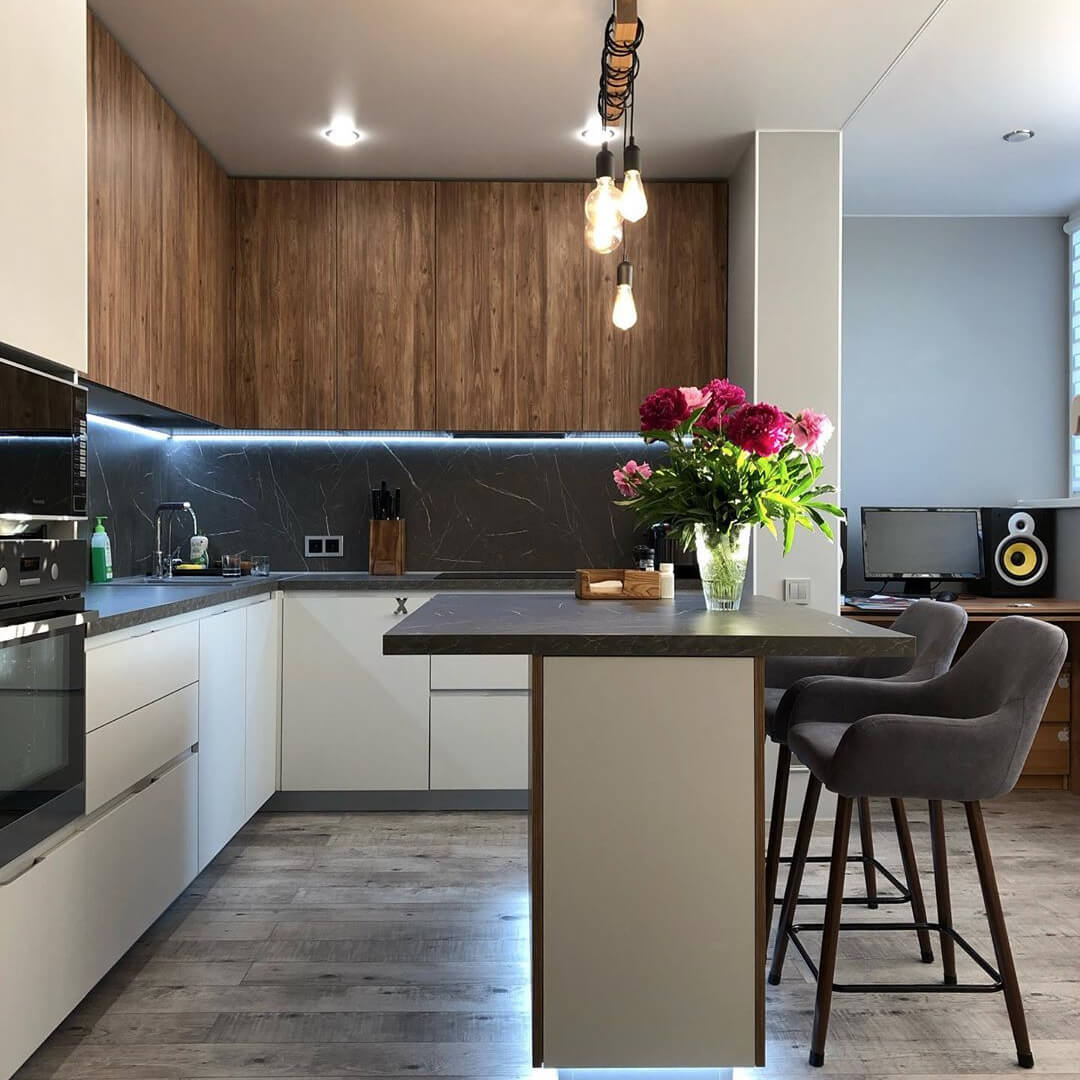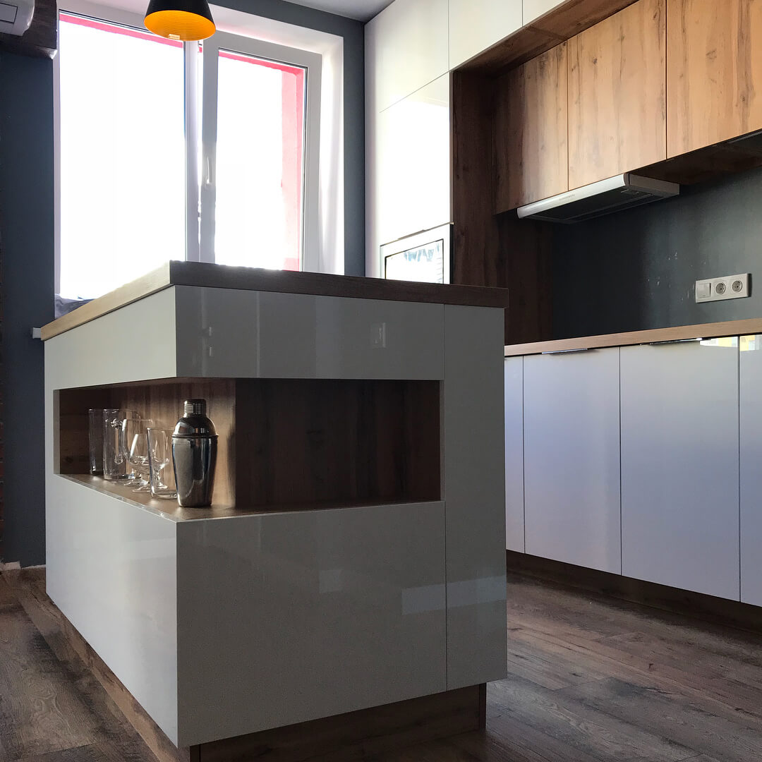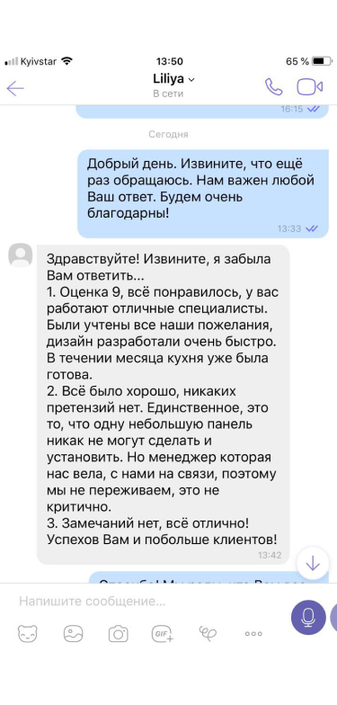 Хотела написать отзыв о работе с вашей компанией. Со мной связались в течение одного дня и сделали просчёт в кратчайшие сроки. С менеджером и дизайном мы слаженно коммуницировали на протяжении всего сотрудничества. Все наши пожелания были услышаны и воплотили все проекты, все наши оправки принимались во внимание и быстро корректировались. Наш заказ кухни выполнили за 4 недели после подписания договора. Мы остались очень довольны кухней