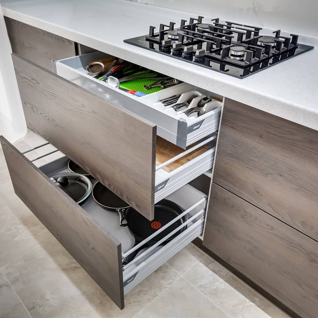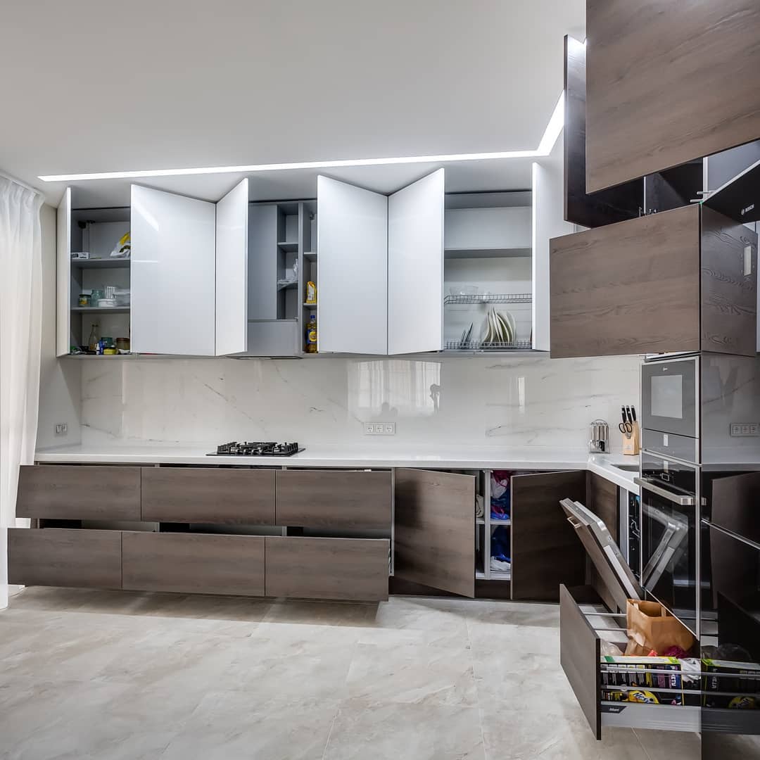 Погонный метр кухни - это метр верха и метр низа. Но! От чего же зависит его стоимость? Она зависит от того будут ли использоваться подъёмные механизмы или распашные дверцы, какие виды выдвижных механизмов и ящиков будут установлены. А также от того какие материалы вы выбираете для фасадов и столешницы вашей будущей кухни.