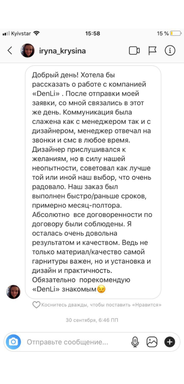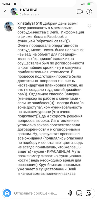Добрый день! Хотела рассказать о работе с компанией «Denli». После отправки моей заявки, со мной связались в этот же день. Коммуникация была слажена как с менеджером так и с дизайнером, менеджер отвечал на звонки и смс в любое время. Дизайнер прислушивался к желаниям, но в силу нашей неопытности, советовал как лучше той или иной наш выбор, это очень радовало. Наш заказ был выполнен быстро/раньше сроков, примерно месяц-полтора. Абсолютно все договоренности по договору были соблюдены. Я осталась очень довольна результатом и качеством. Ведь не только материал/качество самой гарнитуры важен, но и установка и дизайн и практичность. Обязательно порекомендую «Denli» знакомым